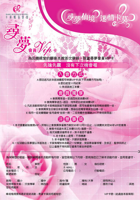 這是目前新開幕時,於Chenk-in時,服務人員會把下面這張A4大小的會員VIP卡的申辦給您填寫,並於退房時,再請您將它交給服務人員約2分鐘後,服務人員立即將VIP卡贈送給您哦~![]()
